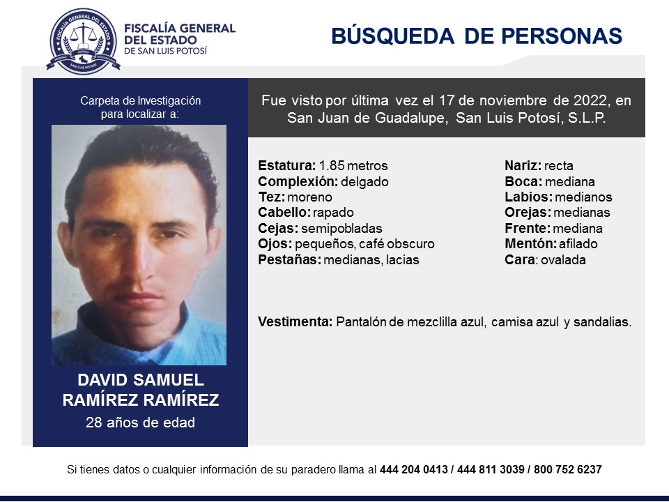Solicitamos tu colaboración para localizar a David Samuel Ramírez Ramírez, quien fue visto por última vez en San Luis Potosí,