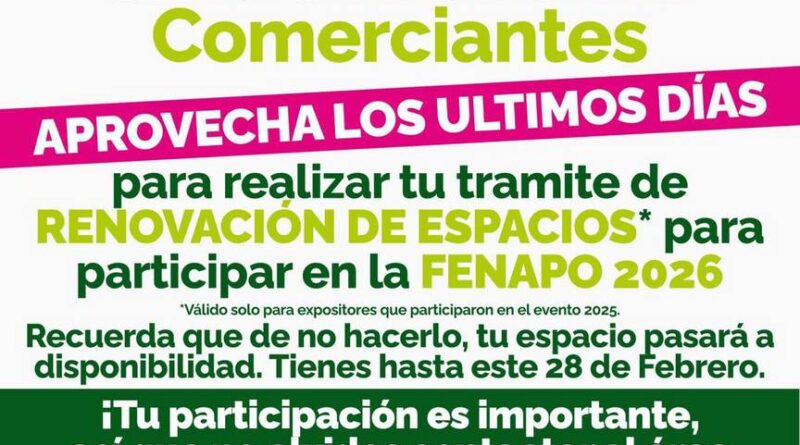 El Patronato de la Feria Nacional Potosina (Fenapo), informó que las y los comerciantes que participaron en 2025 deberán realizar su trámite de renovación antes del 28 de febrero para garantizar su espacio en la edición 2026.