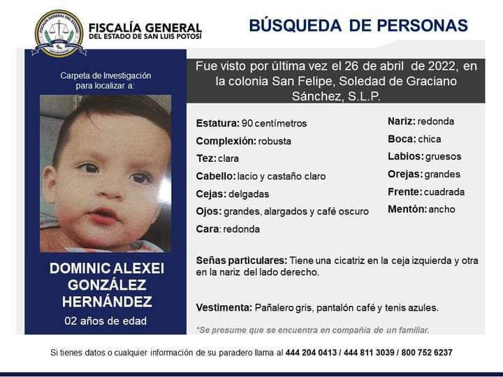 Solicitamos tu colaboración para Dominic Alexei González Hernández, quien fue visto por última vez en la colonia San Felipe, Soledad de Graciano Sánchez, SLP.